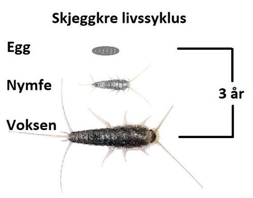 I Norge lever skjeggkreet kun innendørs og blir funnet stadig flere steder. De er observert over hele landet, og mange av funnene er fra moderne leiligheter. Man kan møte dyrene hele året. De spiser både plante- og dyrematerialer. Selv små mengder brødsmuler, mel, matrester, døde insekter, tørre blader eller andre organiske materialer vil være tilstrekkelig til å holde liv i en bestand. Skjeggkre har et spesielt enzym i tarmen som gjør at de også kan spise papir og tapet, men full utvikling fra nymfe til voksen krever en mer variert diett. Livssyklusen er lang, klekketiden på egg under perfekte forhold (21,5°C og 60 RF%) er ca. 2 mnd, men antatt lengre i bygninger der forholdene ikke er like kontrollerte som i et laboratorium. Videre utvikling fra nymfestadiet (ca. 2 mm) til voksen strekker seg normalt opp mot 2,5 -3 år. Etter kjønnsmodning kan de voksne leve i ytterligere ca. 3 år, og de legger i gjennomsnitt 56 egg pr år. Voksne individer kan overleve i opptil 9 måneder uten å ta til seg næring.
