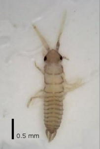 Ut av egget kommer det første stadiet (ca. 2,9 mm). Det skiller seg fra de andre stadiene ved å være lyse, halvgjennomsiktige og nesten hårløse, og ved at de har kortere haletråder og antenner. De har også et klekkeorgan i form av en liten kant i pannen som de bruker til åpne egget. Ved romtemperatur tilbringes kun få dager i dette stadiet. Førstestadiet beskrives som tregt og passivt, og det er i stand til å skifte hud uten å spise. Førstestadiet er trolig lite aktivt siden det har med seg tilstrekkelig næring fra egget og blir derfor sjelden observert.