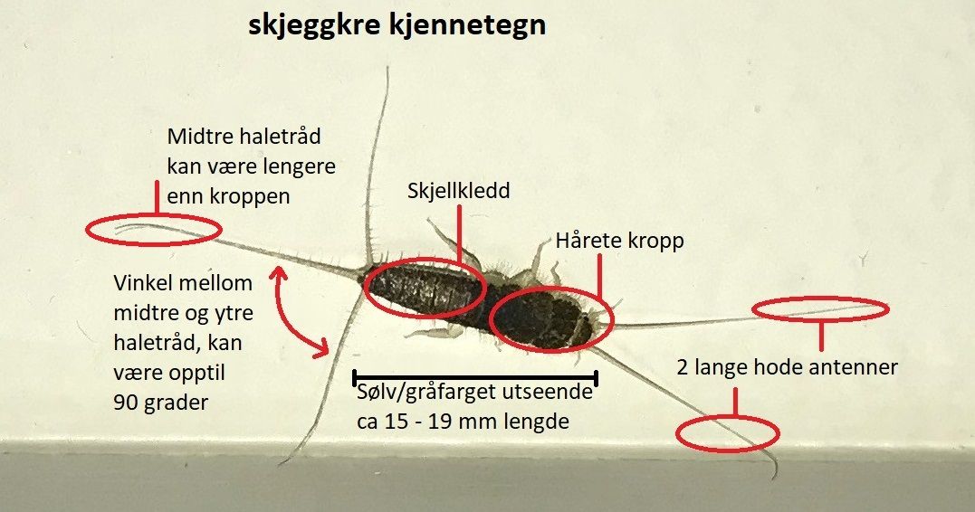 Bilde under et et godt eksempel på skjeggkre. Typisk er at haletrådene er like lange eller lengre enn lengden på kroppen. Det er også typisk at vinkelen på de ytre haletrådene er mer opp mot 90 grader ut fra den midtre haletråden. Husk at kombinasjoner av flere faktorer gir en sikker identifisering. For eksempel: Et sølvkre blir ikke over 12 mm. Er insektet da 15 mm, så er det skjeggkre. Kan insektet klatre loddrett? Sølvkre kan ikke klatre loddrett. Hvor observeres insektet? Skjeggkre kan vandre i tørre omgivelser som for eksempel stue (normalt 20-40% luftfuktighet). Sølvkre trives best i fuktige omgivelser, for eksempel på et bad.